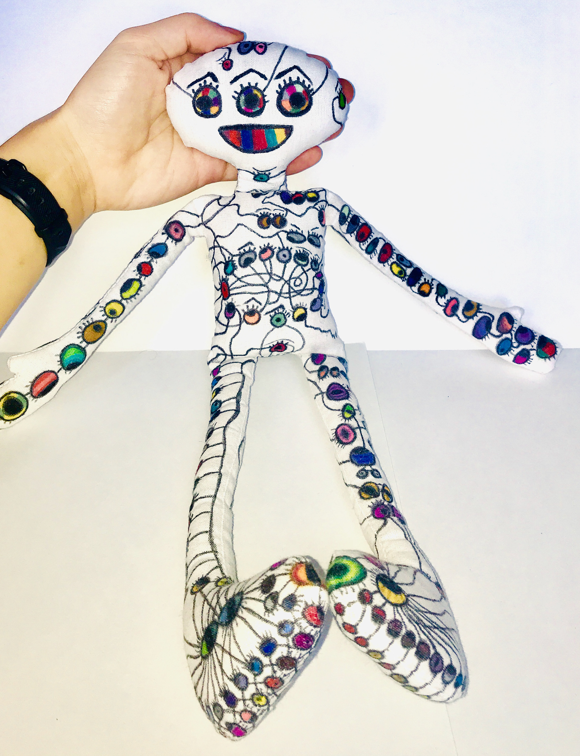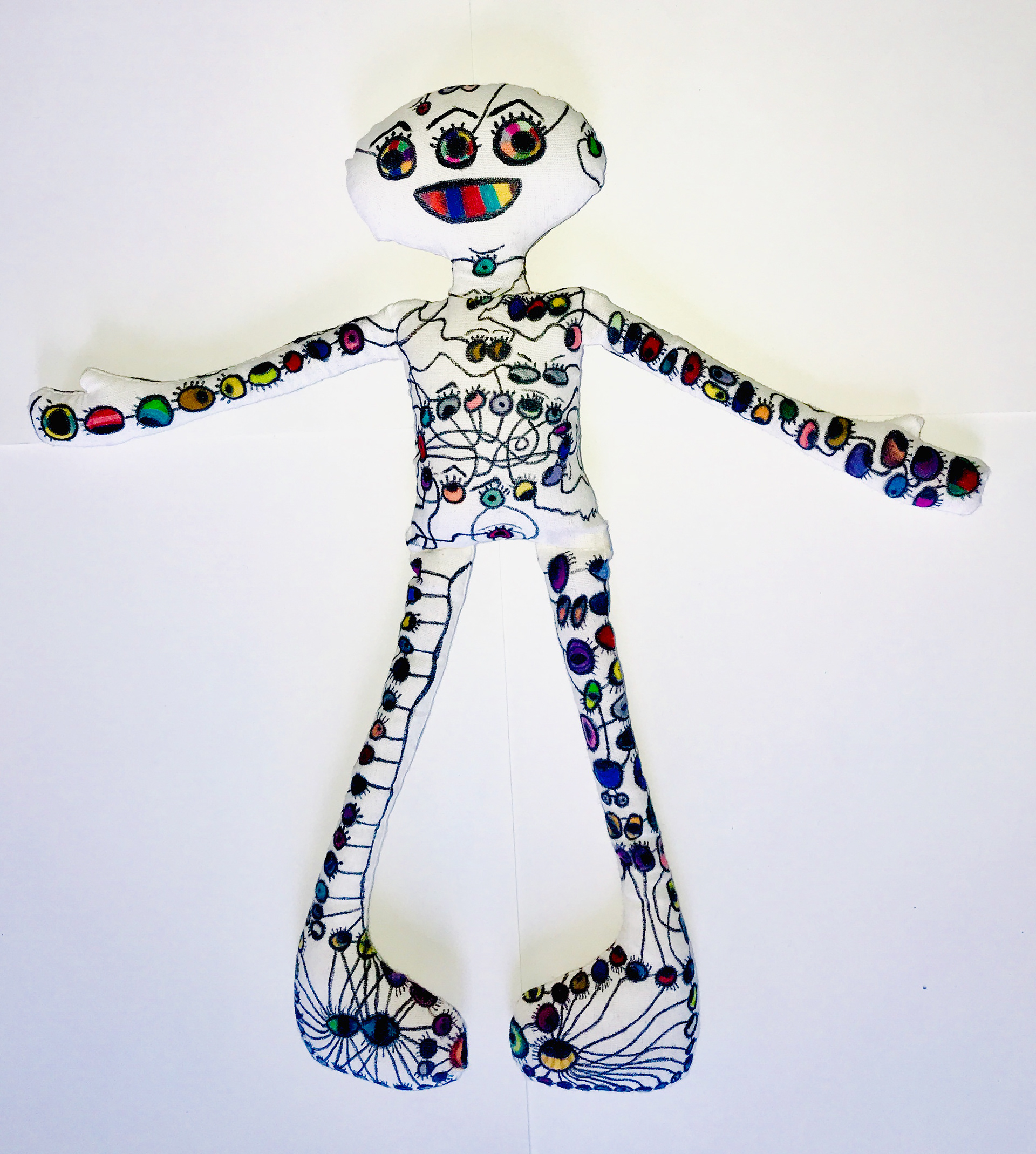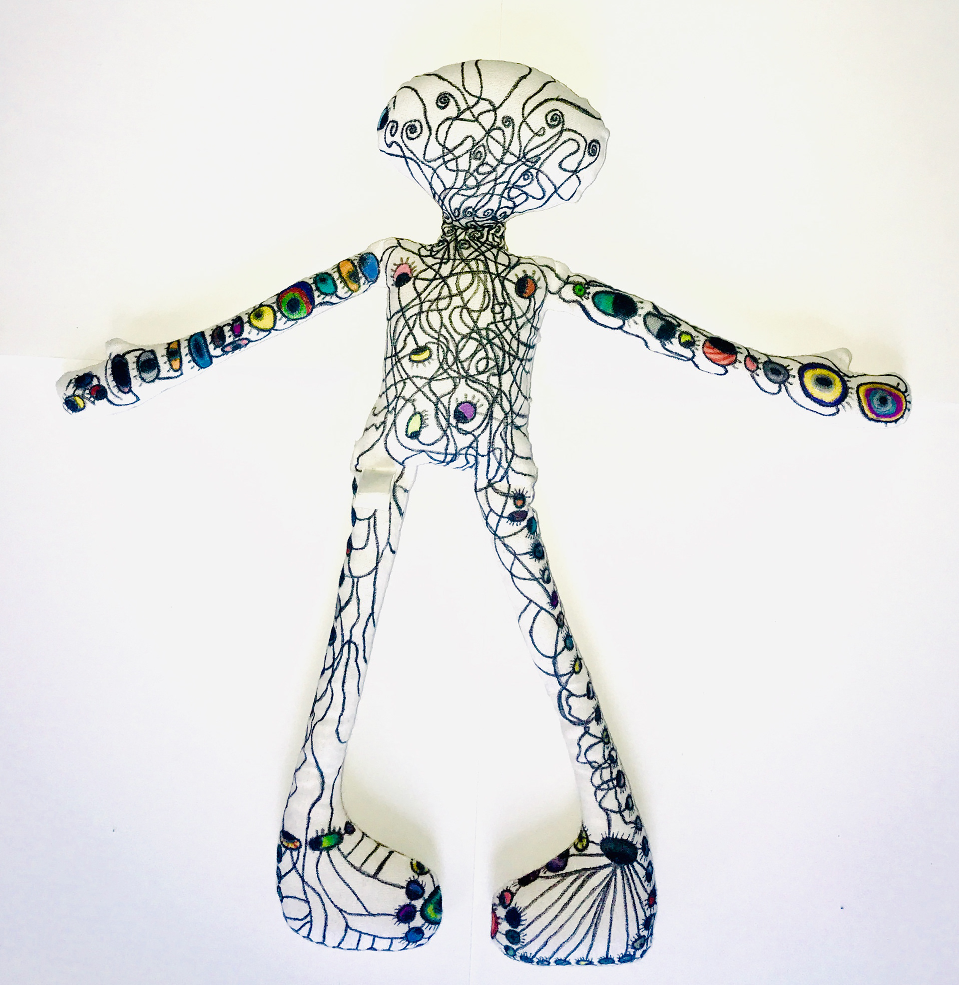 Muslin cloth doll, permanent marker, acrylic sealant