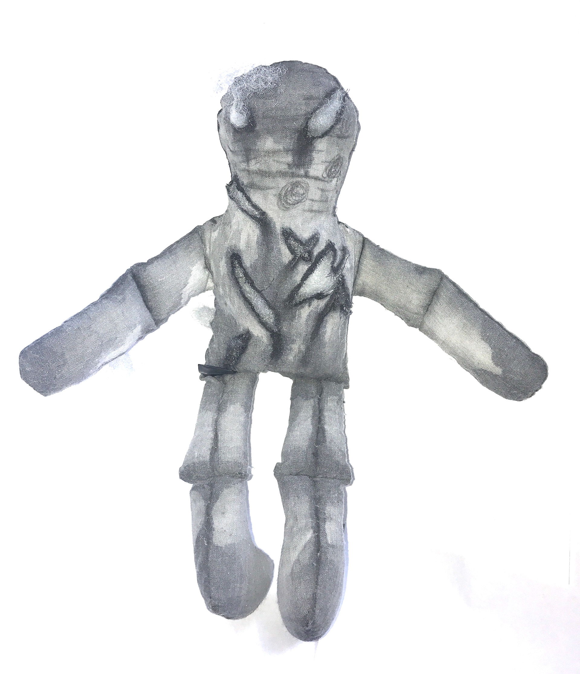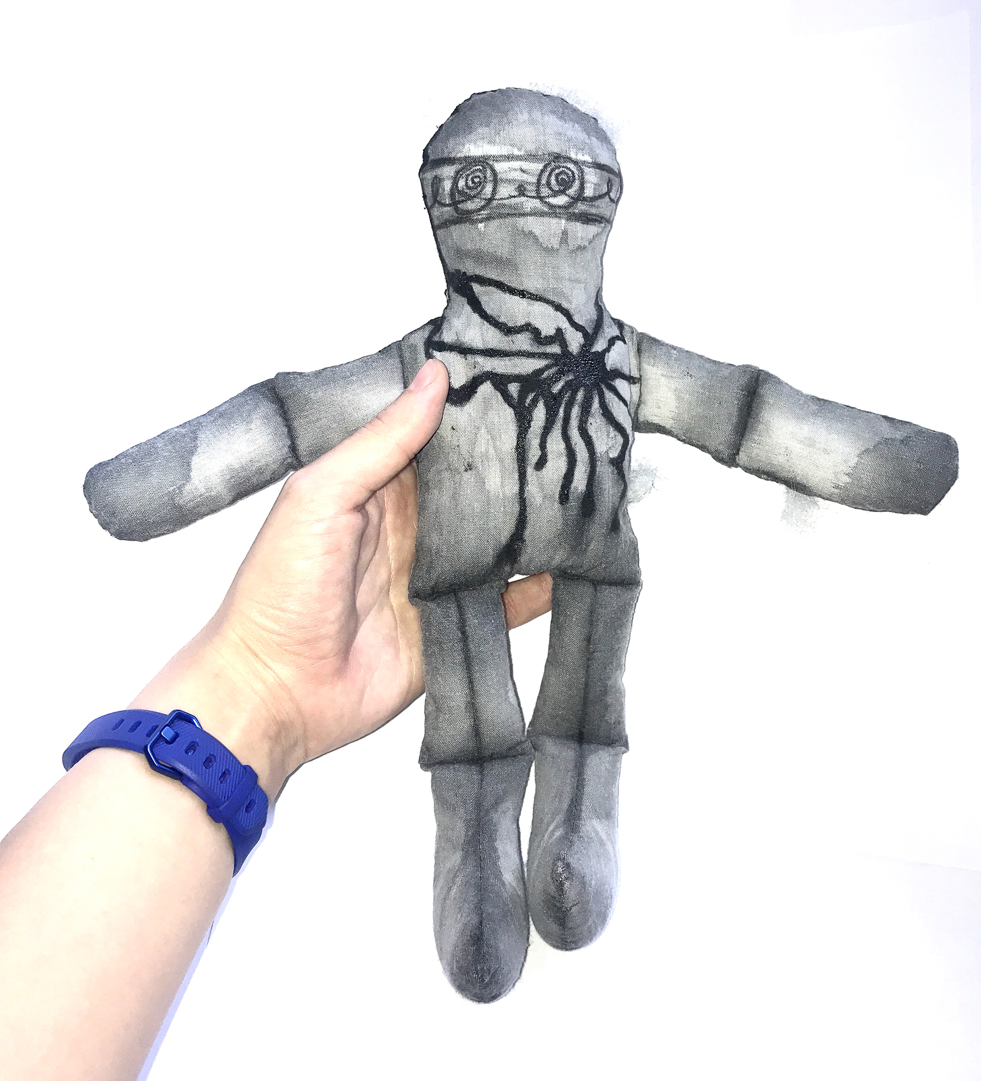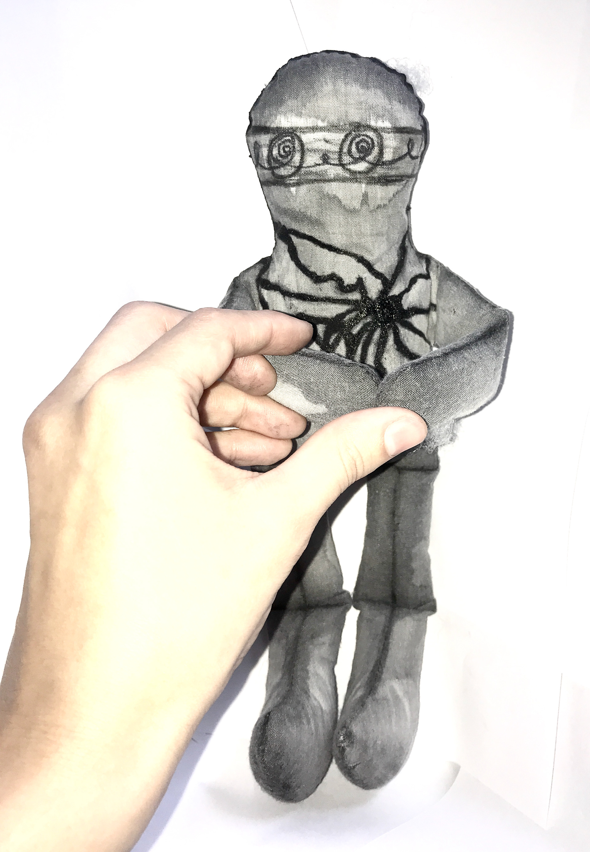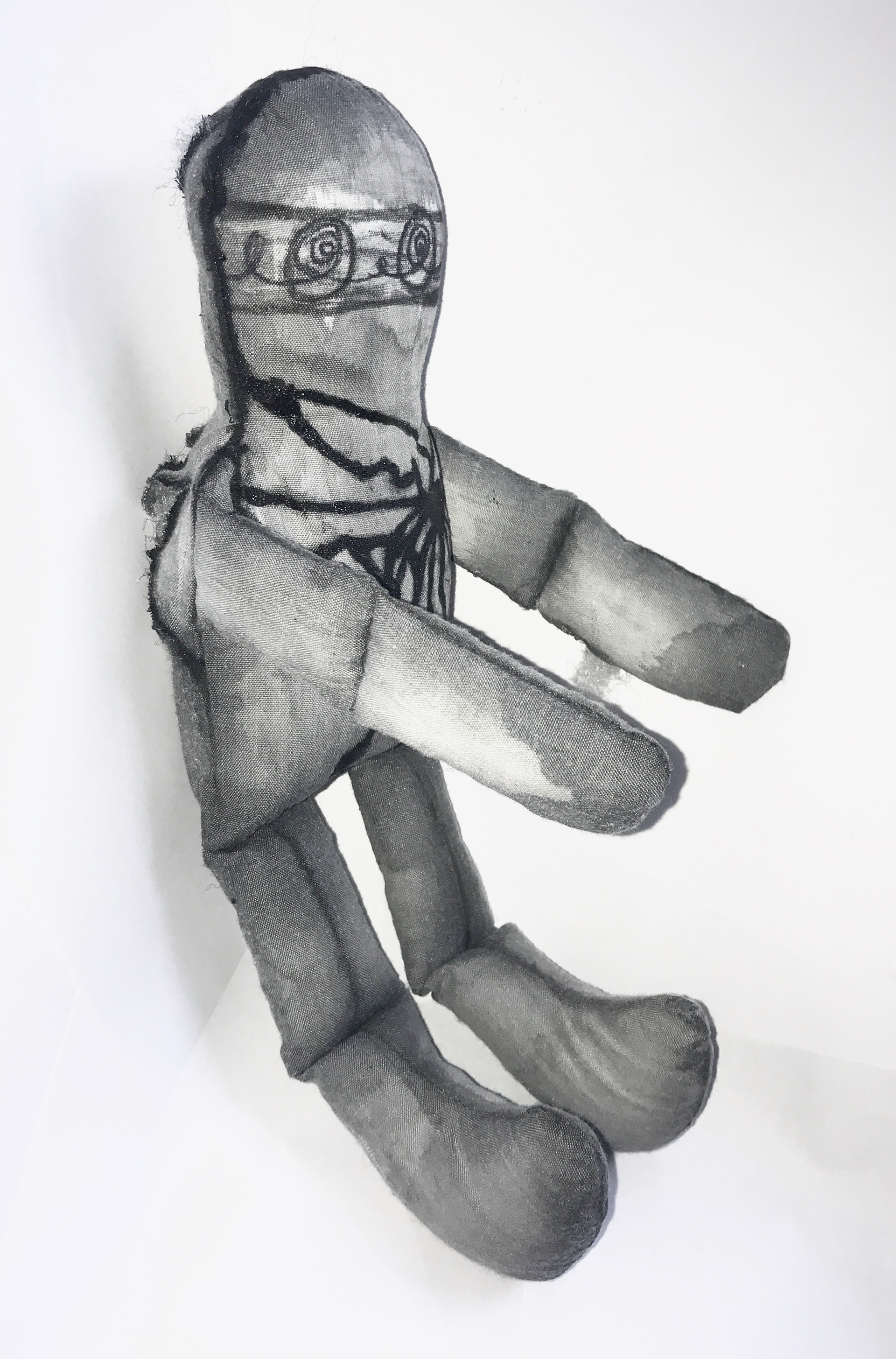 Muslin cloth doll, ink, water, permanent marker, acrylic sealant